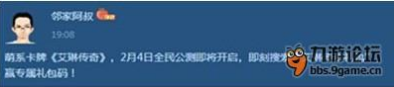在qq,微博,朋友圈,人人等媒体上转发:萌系卡牌《艾琳传奇》,2月4日全民公测即将开启,即刻搜索“艾琳传奇礼包”,赢专属礼包码!并截图回帖