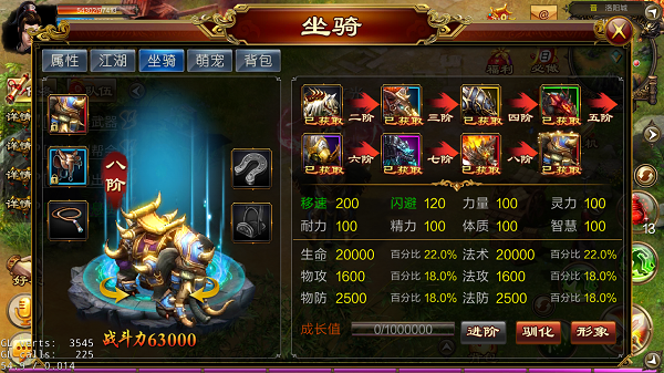 Ø 一进入游戏就自动获取一阶坐骑“照夜白”,45级左右完成主线任务可以获得一颗蓝色坐骑进阶丹,使用后可以把坐骑进阶到二阶。